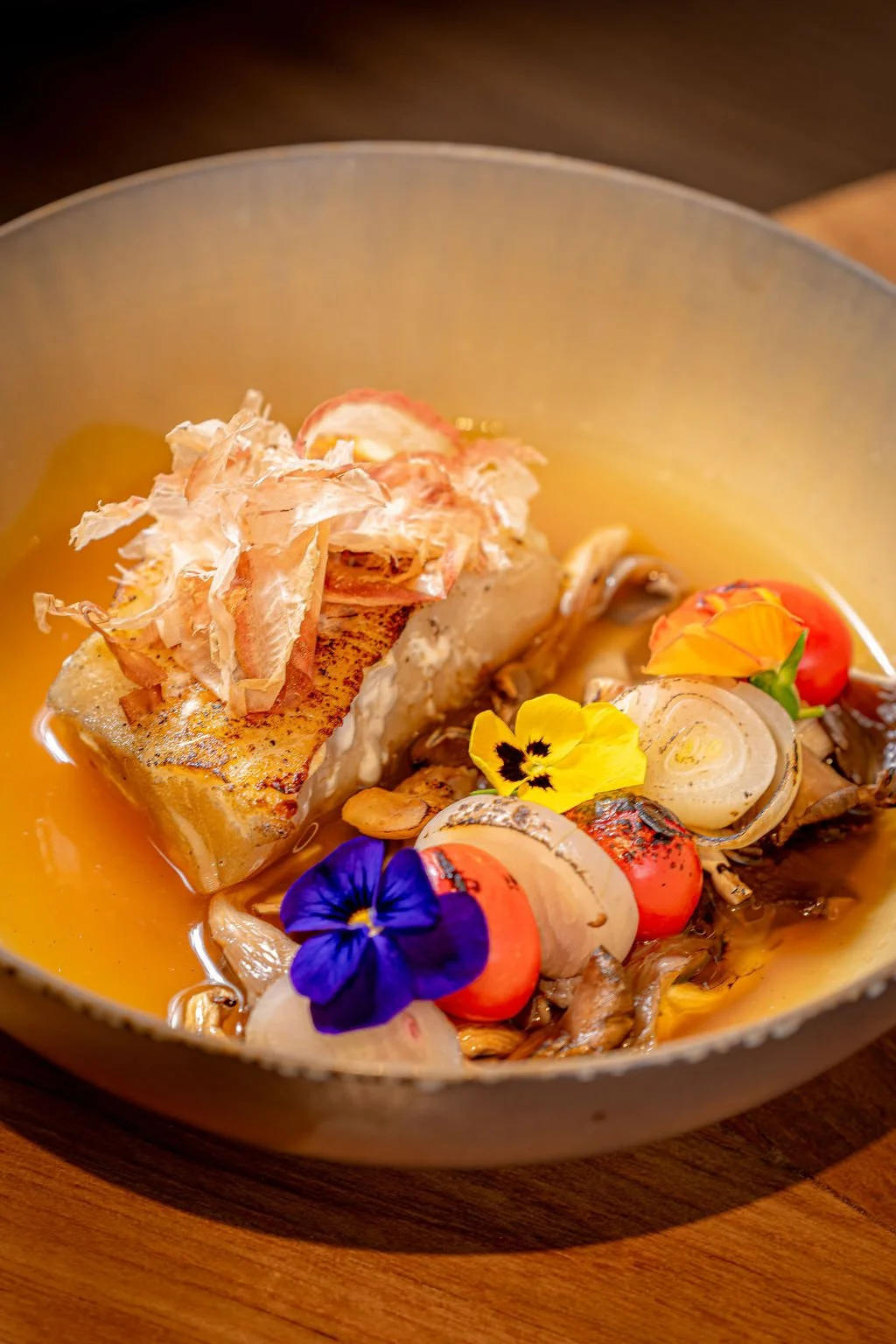 Thai broth made from grilled dried fish, tamarind, fish sauce and lime juice, fillets of grilled sea bass.