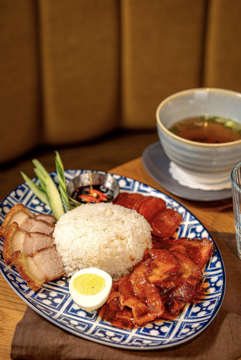 BBQ pork, crispy pork belly, sweet pork, scallions, cilantro, over rice served with boiled egg.